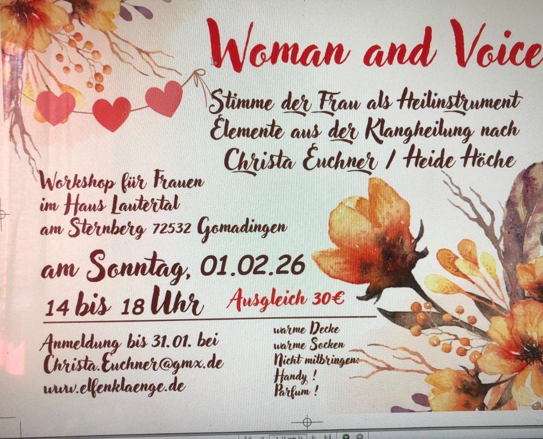 Workshop für Frauen mit Elementen aus der Klangheilung nach Christa Euchner und Heide Höche. Bitte mitbringen: warme Decke, warme Socken Nicht mitbringen: Handy, Parfüm Ausgleich: 30 Euro Anmeldung: bis 31.01.2026 bei Christa.Euchner@gmx.de